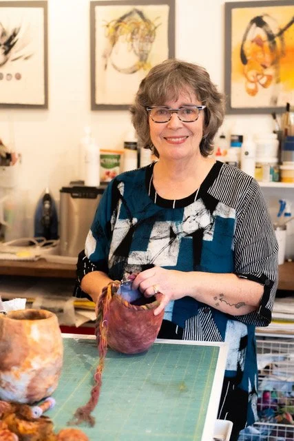 Grounded in her family’s needlework traditions, Susan’s practice has evolved from functional craftsmanship to innovative artistic exploration. Her work often emphasizes mark making, text, and narrative within a controlled colour palette, shifting towards abstraction through the layering of cloth, paper, and found materials. She integrates recycled elements, as well as painted, waxed, or cut paper into her pieces. Currently, she is focused on the creation of dimensional body and vessel forms that explore feminine attributes, spanning a conceptual timeline from pre-birth to death.